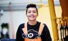 Ailip aaqqatini sullisit nuannaarluni atigai. Taanna Nuummi biilileriffimmi arnartatuaavoq.